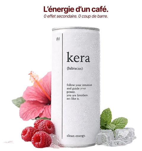 Kera t’apporte une énergie douce et progressive grâce à la caféine naturelle du guarana sauvage, associée à des plantes bio qui apaisent et équilibrent (hibiscus, camomille, feuilles de framboisier, menthe poivrée, gingembre). Contrairement au café, l’effet est moins brutal, plus étalé dans le temps, et sans le “coup de barre” qui suit souvent. En plus, Kera hydrate et rafraîchit, là où le café peut parfois déshydrater et agiter.